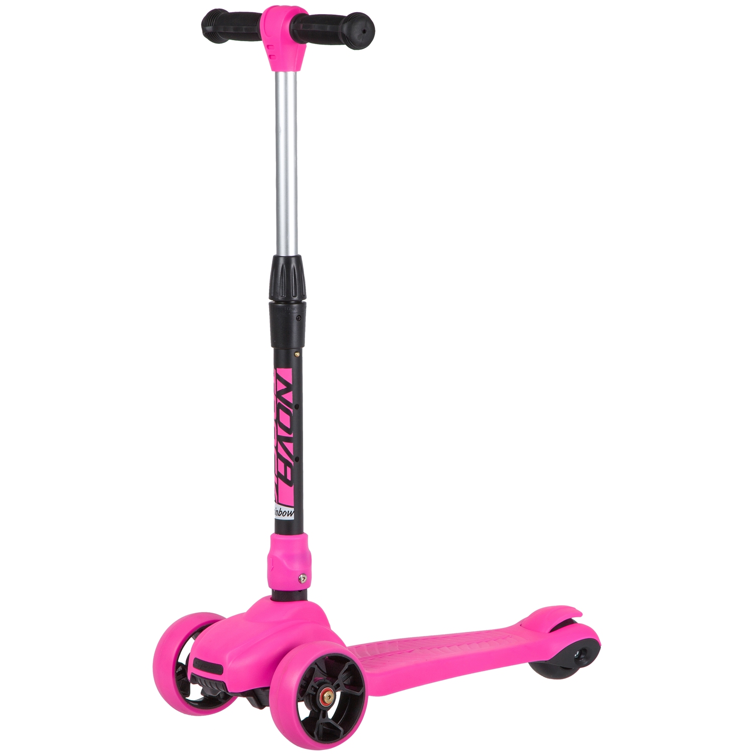 Novatrack RainBow - детский трёхколесный самокат-кикборд c оригинальным дизайном, предназначенный для детей от 3 лет. Cветящиеся при движении колеса обязательно обрадуют вашего ребенка и сделают его более заметным в темное время суток. Самокат выдерживает вес до 60 кг.