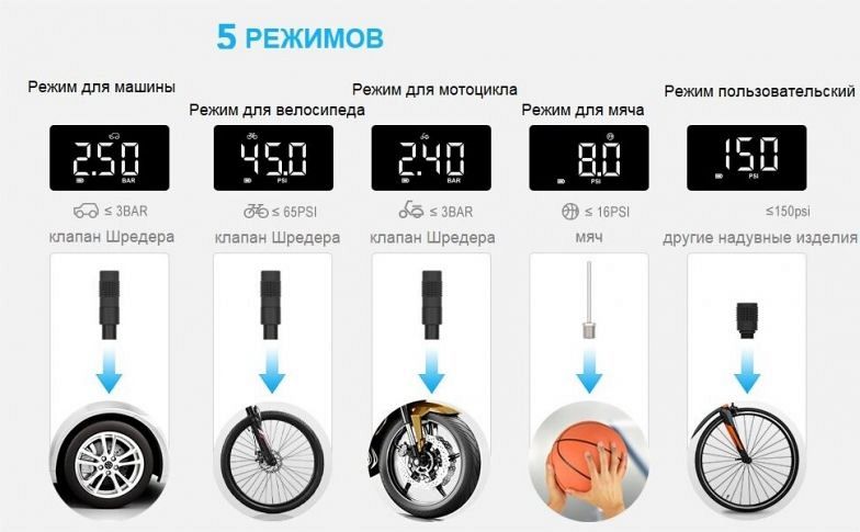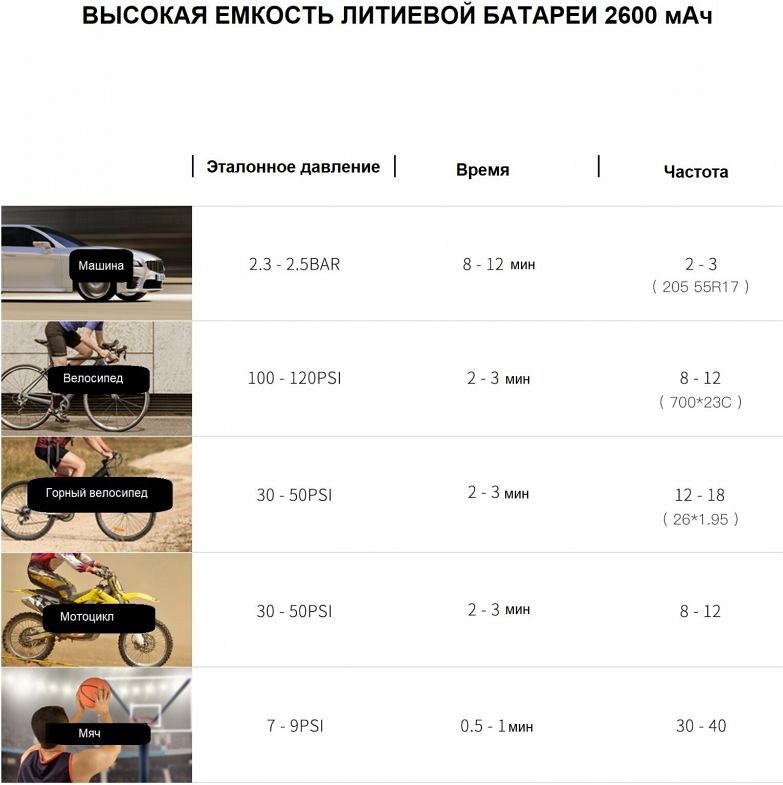 Компрессор для шин Cycplus A8 имеет 2600 мАч встроенный перезаряжаемый литиевый аккумулятор с зарядным шнуром Type-c, поддерживает быструю зарядку QC 3.0. Он может накачать 3 автомобильные шины, 12 велосипедных шин или 40 баскетбольных мячей всего за одну полную зарядку. Для накачки одной полностью спущенной велосипедной шины требуется всего 3 минуты, для одной автомобильной шины 205/55R17 – 8-12 минут. Cycplus A8 может отображать давление в реальном времени на светодиодном дисплее при подключении к шине. Встроенная светодиодная аварийная лампа воздушного компрессора позволяет удобно накачивать и менять шины в темноте.