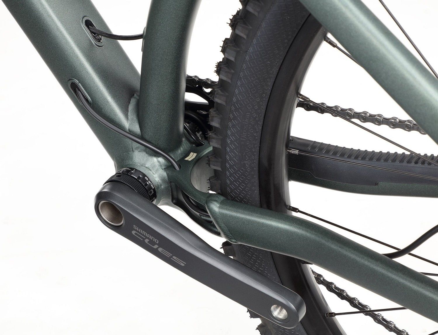 - Трансмиссия Shimano Cues с 11 скоростями и системой Shadow Plus.