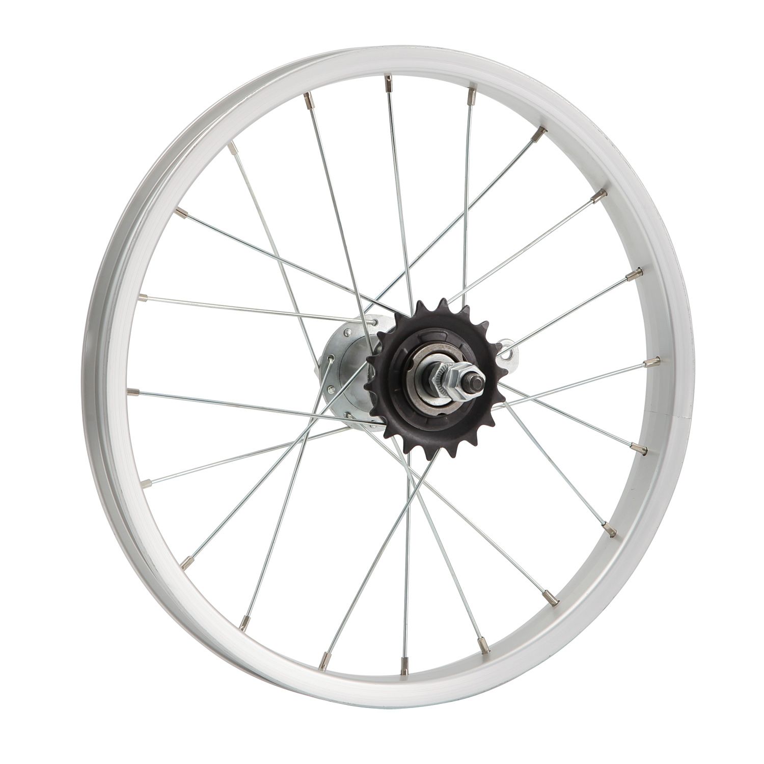 Колесо 16" заднее в сборе (без резины) с одинарным алюминиевым ободом на 20 спиц с втулкой под гайку.